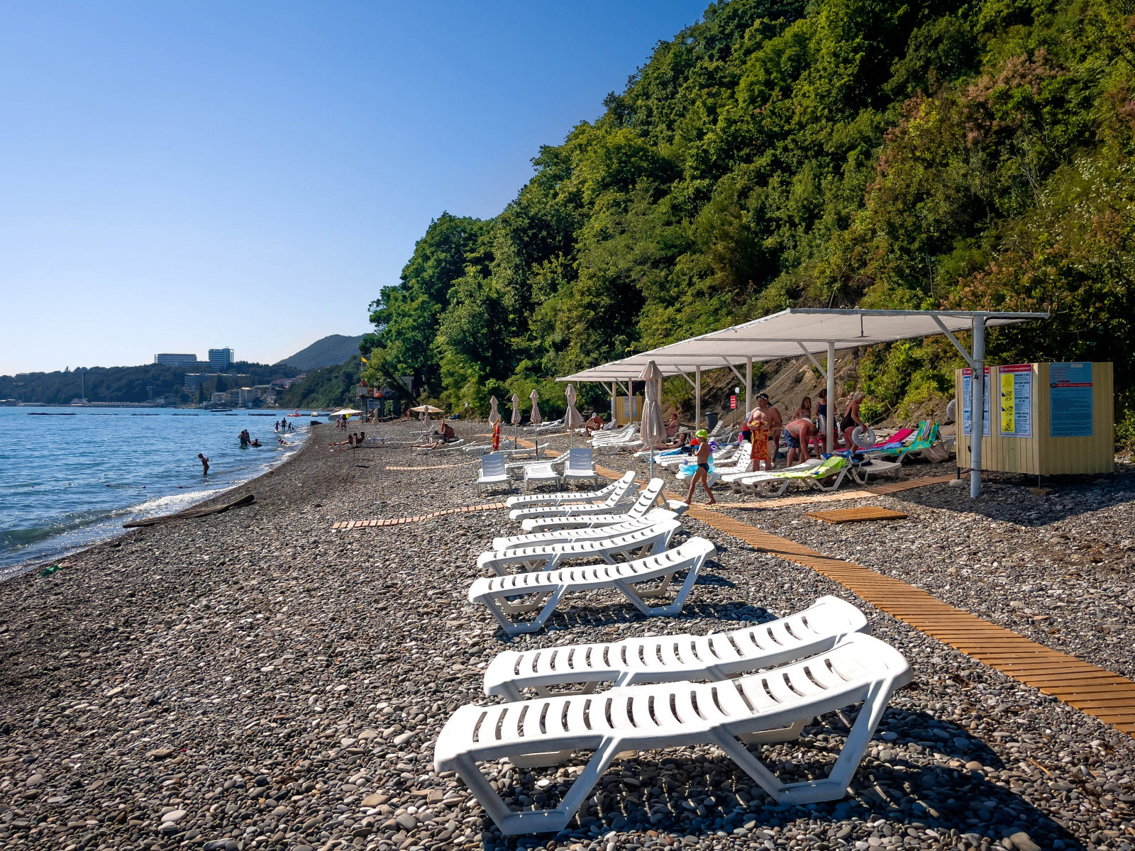 Место для плавания огорожено, на пляже работают спасатели и ежедневно проводится уборка.